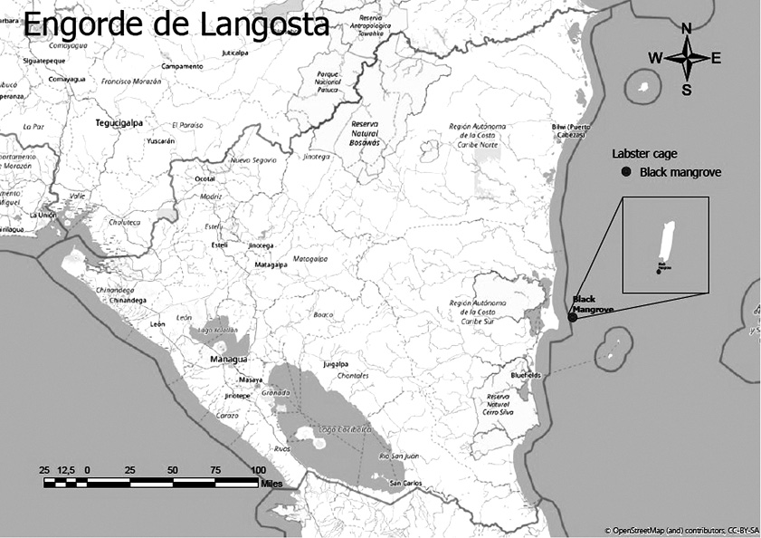 El 21 de diciembre de 2018, se obtuvieron langostas juveniles y sub-adultas en el monitoreo de refugios artificiales (casitas cubanas) establecidos para el proyecto. Se transportaron en cajas de plástico con capacidad de 100 lb y se colocaron 85 organismos en una jaula flotante de 2 x 2 x 2.30 m en Black Mangrove Cay en las coordenadas 12.584968° y 83.311545° W (Figura No. 1). Se alimentaron diariamente con sardina (Opisthonema oglinum) a razón del 7% de su peso, durante 153 días. Se les realizaron biometrías cada 30 días aproximadamente, tomando una muestra aleatoria de 20 organismos y registrando las variables peso (W), longitud total (LT) y longitud del cefalotórax (LC). Se registraron las características del agua, temperatura (°C), pH, salinidad (g L-1), turbidez (m) y velocidad de la corriente (ft s-1), durante el periodo del estudio.