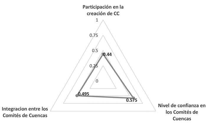 La integración intracomunitaria en la subcuenca del río Ulí, en el que se valoraron los indicadores de participación en la creación de los Comités de Cuencas (CC), Integración de los CC y el nivel de confianza en esos comités, dimensión que alcanzo una puntuación 0.5, ver figura No. 5. Lo que implica una deficiente participación de la comunidad.