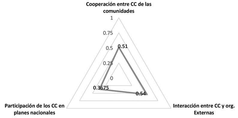 La Conexión extracomunitaria incorpora los indicadores de participación de las instancias comunitarias que trabajan el tema de cuencas o hídrico, las relaciones internas y externas de los comités comunitarios y la confianza que tiene estos en las instituciones externas, en la que se obtuvo una valoración de 0.6, ver figura No. 6, lo que se considera regular.