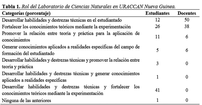 There was a significant incidence of the Natural Sciences Laboratory in the student's educational process and contributions to teaching, with a general average of 82%, highlighting the link between theory and practice, the usefulness of acquired knowledge for academic and professional performance to strengthen their ability to analyze, develop skills and abilities, among others. They were able to identify the potential of the laboratory and some limitations that are part of the reality of this.