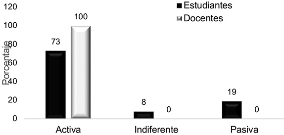 Respecto a la valoración de docentes y estudiantes en relación a la participación en las prácticas de laboratorio que realizaron, se evidencia mayores apreciaciones. Los docentes sostienen que fueron activos sus involucramientos;, no obstante, los estudiantes sólo el 73 % apuntó a esta apreciación, distribuyéndose en pasiva e indiferente un 27 % del total consultado (Figura No. 13). Aun así, con estos resultados se considera satisfactoria en una escala buena, no obstante, hay correspondencia con la cantidad de estudiantes que opinaron en relación a la infraestructura de los laboratorio (Figura No. 23), probablemente la actitud y participación del estudiantado tenga que ver con el grado de motivación y comodidad que existe en el laboratorio, siendo estos elementos que no favorezcan positivamente el desarrollo de sus prácticas en función de la infraestructura, pero no de la adquisición de conocimientos.
