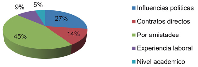 Los resultados de entrevistas aplicadas al personal clave y a los trabajadores de la institución demuestran que los principales factores inciden en las políticas de selección y contratación de personal son: el 45% es por amistades, 27% lineamiento o influencia política, recomendaciones del dirigente político (aval político), experiencia laboral en algunas áreas, record de policía, contratos directos y el nivel académico (véase la figura 1).
