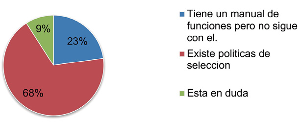 El 68% de los entrevistados expresaron que sí existen políticas de selección de personal, pero que prácticamente desconocen el procedimiento correcto para la selección y contratación del personal y el 23% de los entrevistados manifestaron que “existe un manual de funciones pero que no lo ponen en práctica” (véase la figura 2).
