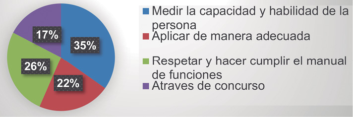 Los resultados obtenidos por medio de la aplicación de las entrevistas demuestran que para la buena ejecución del proceso de selección y contratación del personal, la alcaldía municipal debe medir la capacidad y habilidad de la persona (35%), aplicar de manera adecuada o transparente de acuerdo a lo establecido en la ley de contratación dependiendo del perfil del puesto y ver el perfil profesional del candidato (22%), respetar y hacer cumplir el manual de funciones (26%) (Véase la figura 4).