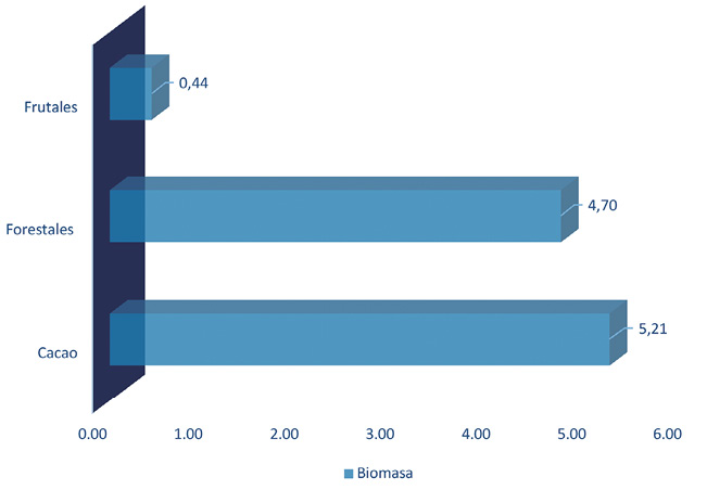 Al igual en los SAF de Talamanca Costa Rica, donde se han encontrado valores de 3.56 t/ha de biomasa (Chacón, 2007). Los resultados de biomasa son similares con los reportados de investigaciones de otros autores en diferentes condiciones, el componente cacao posee mayor cantidad de biomasa, debido a que es el cultivo principal del sistema con densidad poblacional mayor en comparación a las demás especies de sombra (frutales y forestales).