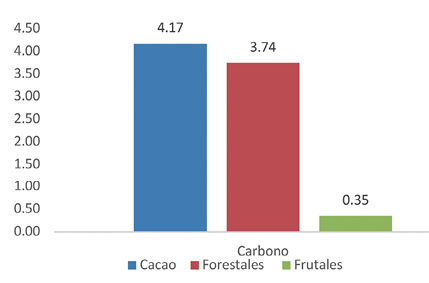 En caso del cacao, los mismos investigadores estimaron que a los 15 años de edad esta especie aporta hasta 1.93 toneladas de carbono por hectárea al sistema agroforestal, combinados con otras especies y con densidad de siembra estable de 4 X 3 m. Resultados que supera a la tonelada de carbono almacenado en cacao del SAF de Los Laureles (1.47 t C /ha). La diferencia se debe a la densidad de siembra que tiene los dos estudios ya que el sistema agroforestal del presente estudio tiene una distancia de siembra de 4 x 4 m, la cual tiene variación en número de plantas e igual, la edad, las condiciones edafoclimáticas, topografía entre otros, los cuales influye en el almacenamiento de carbono.