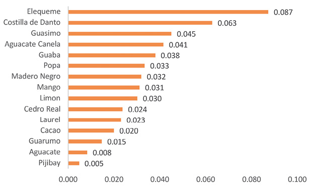 El almacenamiento de carbono depende directamente del estado, estructura, textura y composición de cada especie. Por lo tanto, las especies que resultaron con mayor contenido de carbono por m3 fueron: elequeme (Erythrina poeppigiana), costilla de danto (Lecointea amazónica), y guásimo (Luehea candida).