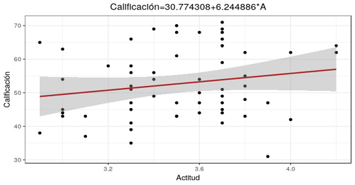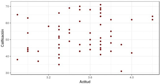La Figura 3 muestra el diagrama de dispersión de la actitud promedio comparada con la calificación de cada estudiante, la nube de puntos está muy dispersa, lo que significa que existe poca o ninguna relación lineal entre las variables actitud y calificación.