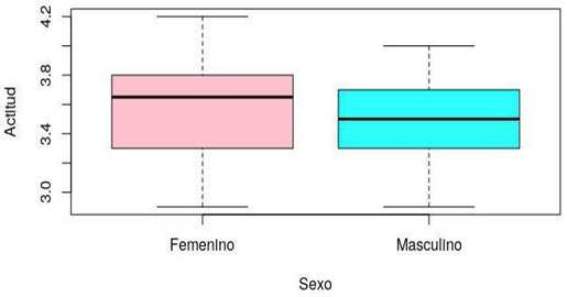 La actitud en los varones es más simétrica o menos dispersa (más homogénea) que, en las mujeres, es decir, la actitud varía más en las mujeres que en los varones. La mediana de la actitud en el sexo femenino es mayor que en el masculino. La distribución de la actitud en el sexo femenino presenta un sesgo a la izquierda, lo que influye sobre la media ubicándola la izquierda de la mediana (Figura 2).